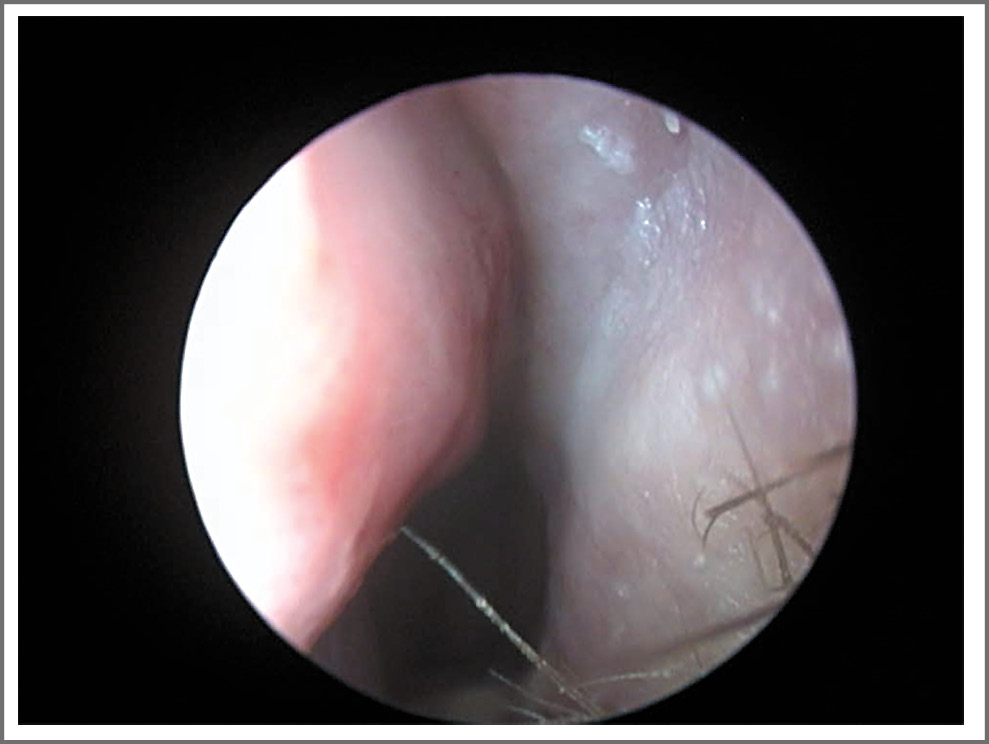 Локальный статус: форма наружного носа не изменена. Область проекции околоносовых пазух визуально не изменена, безболезненна при пальпации и перкуссии. Слизистая носа гиперемирована, пастозна, слизистое отделяемое в носовых ходах. В области перегородки носа с 2 сторон имеется гиперемированный инфильтрат с признаками флуктуации (рис. 3). Носовое дыхание резко затруднено. Полость носа не обозрима.