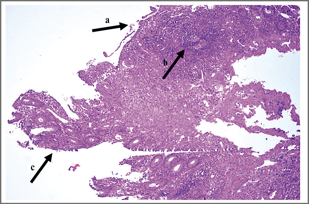 Рис. 4. Фрагмент слизистой оболочки толстой кишки с очаговым некрозом поверхностного эпителия (a). Край язвенного дефекта. Воспалительный инфильтрат проникает через мышечную пластинку в подслизистый слой, с участками формирования лимфоидных фолликулов без светлых центров (b). Формирование воспалительного полипа (c). Окраска гематоксилином и эозином ×200.