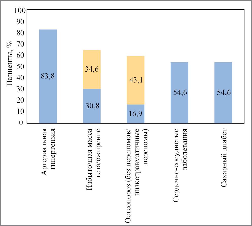 Среди осложнений в активной стадии заболевания наиболее часто регистрировались артериальная гипертензия, избыточная масса тела/ожирение, остеопороз, сахарный диабет, заболевания сердечно-сосудистой системы, включавшие стероидную кардиомиопатию, различные нарушения ритма и проводимости, хроническую сердечную недостаточность (рис. 1). Низкотравматичные переломы диагностированы у 58 пациентов, из них компрессионные переломы тел позвонков выявлены у 48 больных.