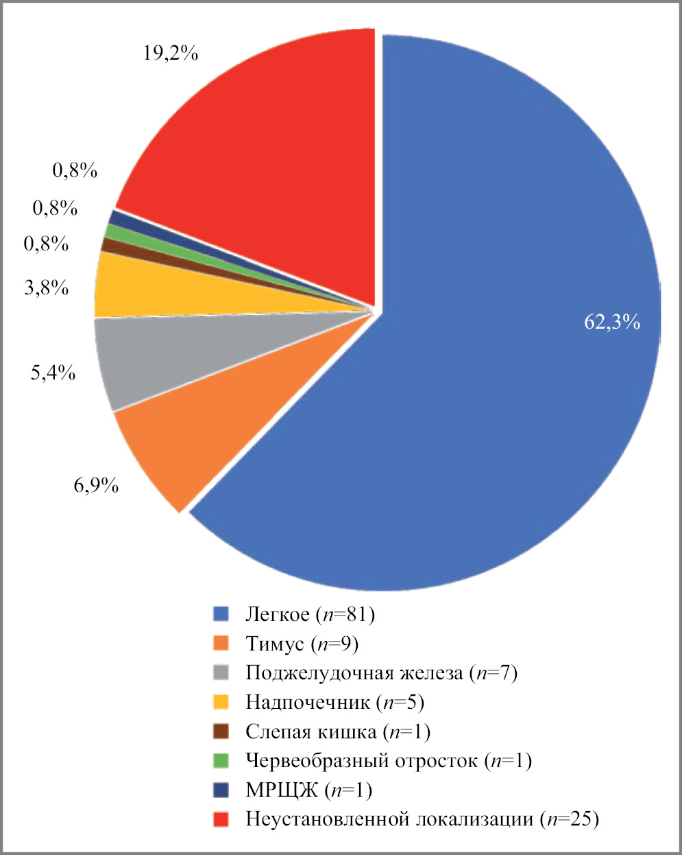 Наиболее частым источником эктопической продукции АКТГ являлись НЭО бронхолегочной локализации, выявленные у 81 (62,3%) пациента. АКТГ-продуцирующие опухоли средостения обнаружены у 9 (6,9%) больных, еще 7 (5,4%) имели НЭО поджелудочной железы. Значительно реже первичный очаг локализовался в надпочечниках (n=5), очень редко – в слепой кишке (n=1) и червеобразном отростке (n=1), в 1 случае выявлен МРЩЖ. У 25 (19,2%) пациентов источник АКТГ-ЭС до настоящего времени установить не удалось (рис. 2). Длительность периода наблюдения больных с неустановленным первичным очагом составила от 1 до 80 мес (Ме 16 мес [10; 30]). Общая характеристика пациентов с различной локализацией НЭО сведена в табл. 2.