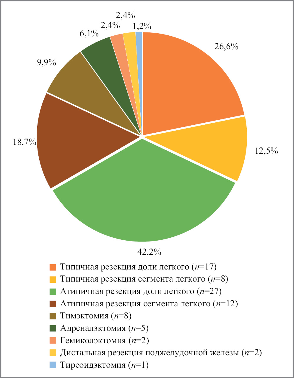 Хирургическое лечение АКТГ-ЭС проведено 110 (84,6%) пациентам, из них первичный опухолевый очаг удален в 63,1% случаев (n=82). Структура оперативных вмешательств представлена на рис. 3.