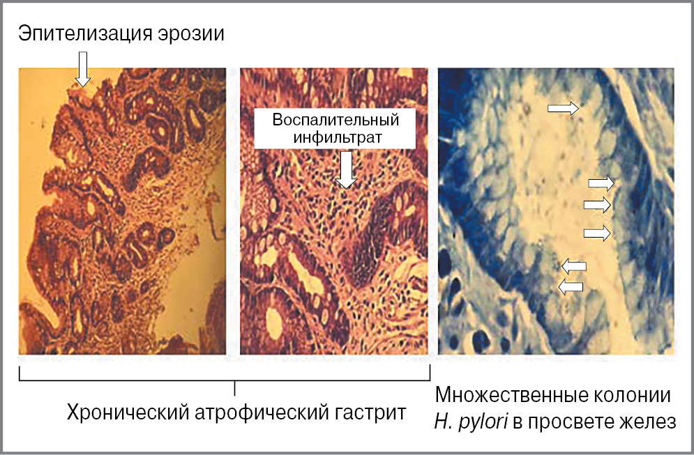 Таким образом, значительная часть больных, подвергнутых эндоскопическому обследованию, характеризовалась одновременным наличием нескольких признаков, отражающих неблагоприятное состояние слизистой оболочки, а именно атрофии, эрозий и текущей инфекции H. pylori (рис. 1).