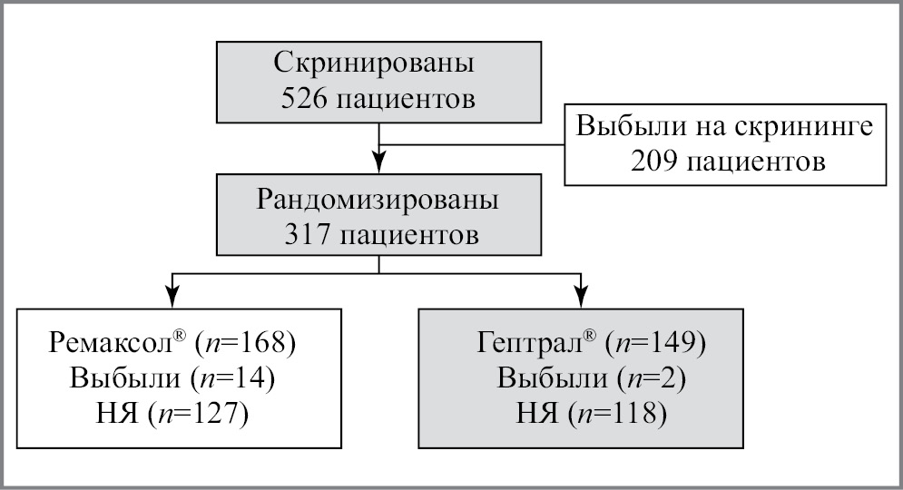 Пациенты исследования (n=317) были случайным образом распределены в одну из двух групп: в группу терапии препаратом Ремаксол® (n=168) либо в группу терапии препаратом Гептрал® (n=149); рис. 1. Приверженность лечению составила 100%.