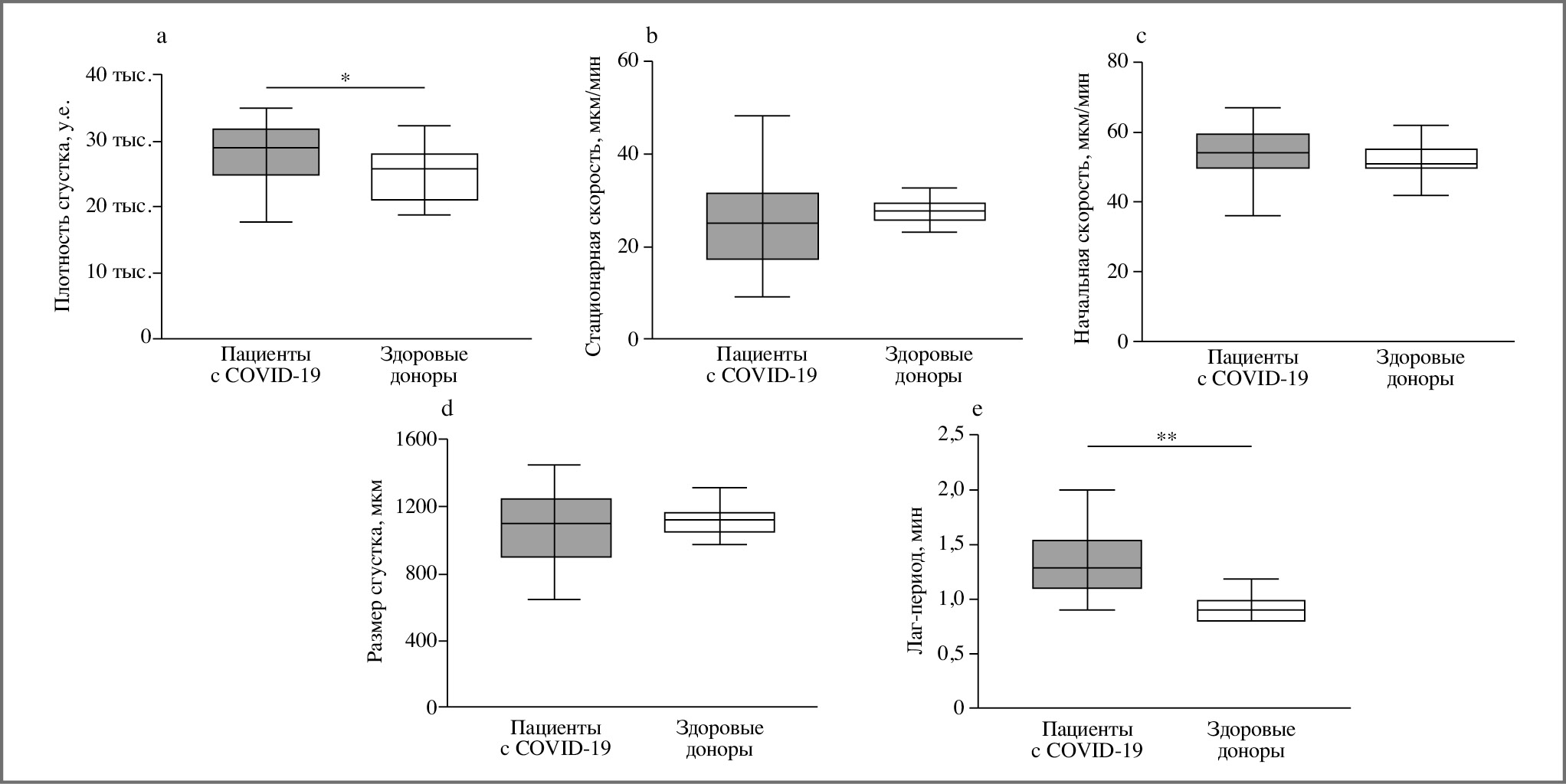 Рис. 1. Параметры тромбодинамики у пациентов с COVID-19 (n=215) и здоровых доноров (n=20): a – оптическая плотность сгустка роста сгустка, b – стационарная скорость, c – начальная скорость роста сгустка, d – размер сгустка, e – лаг-период. Здесь и далее в табл. 2, 3, 5: результаты представлены в виде медианы и ИКР (25; 75-й процентиль). *p<0,01; **p<0,001, критерий Манна–Уитни.