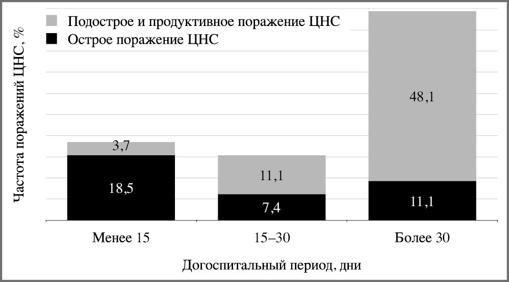 В 8 (27,6%) случаях посмертно диагностировали продуктивный (или адгезивный) лептоменингит (воспаление мягкой и паутинной мозговых оболочек), характеризующийся развитием обширных спаек и сращений мозговых оболочек, что может быть причиной отсутствия изменений при исследовании ликвора. Также данные изменения свидетельствуют о длительности воспалительного процесса. Суммируя все подострые и продуктивные изменения, можно предположить, что у 39,5% пациентов имело место продолжительное повреждающее воздействие на ЦНС, что подкрепляют данные по срокам догоспитального периода у больных ОИТ (рис. 1.) Как видно на рис. 1, у пациентов с подострым и продуктивным поражением ЦНС короткий догоспитальный период заболевания встречался в 5 раз реже, чем при острых состояниях (p<0,05).