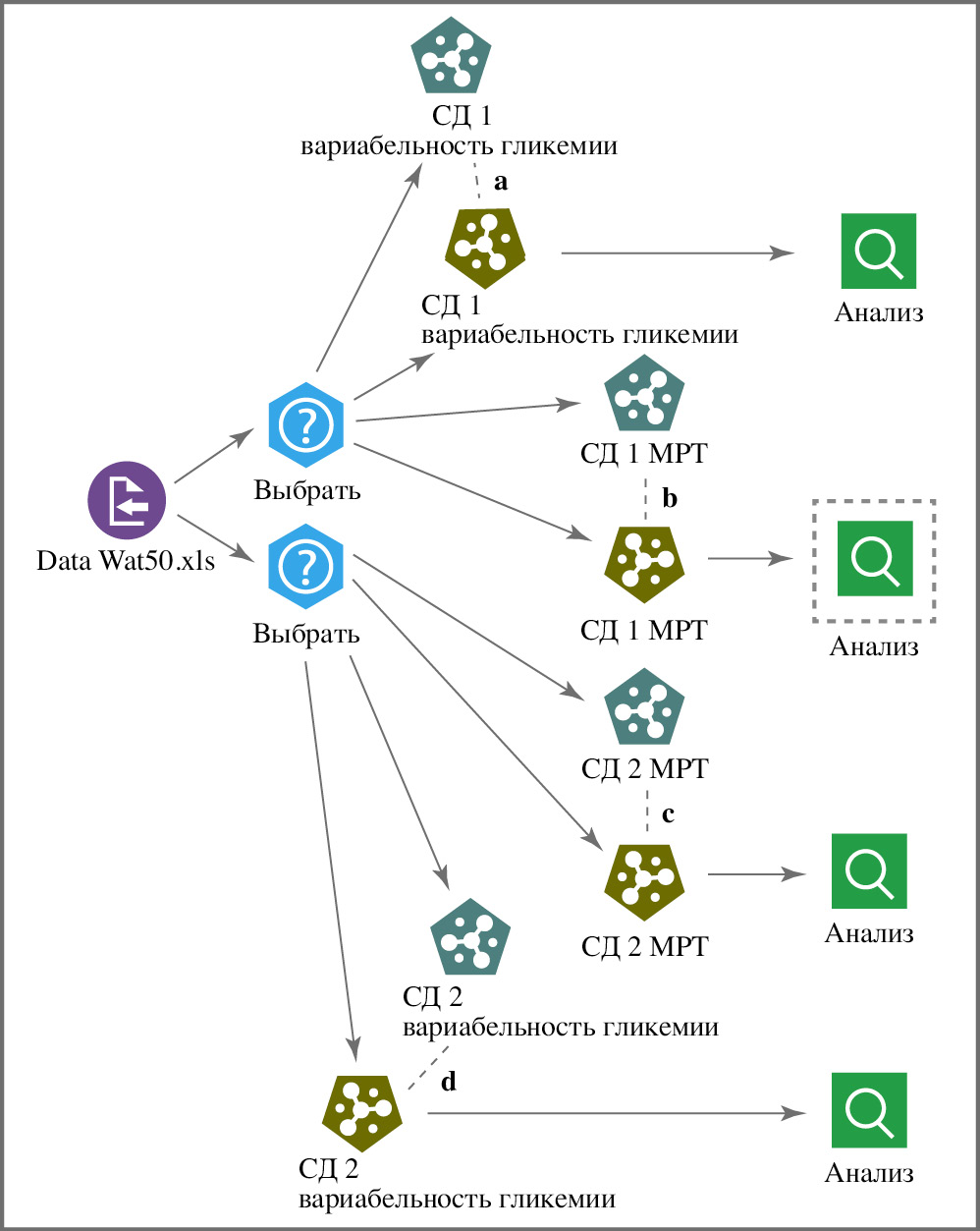 Рис. 1. Общая диаграмма построения нейронных сетей на основе данных МРТ и вариабельности гликемии: a – СД 1, вариабельность гликемии vs МРТ; b – СД 1, МРТ; c – СД 2, МРТ; d – СД 2, вариабельность гликемии vs МРТ.