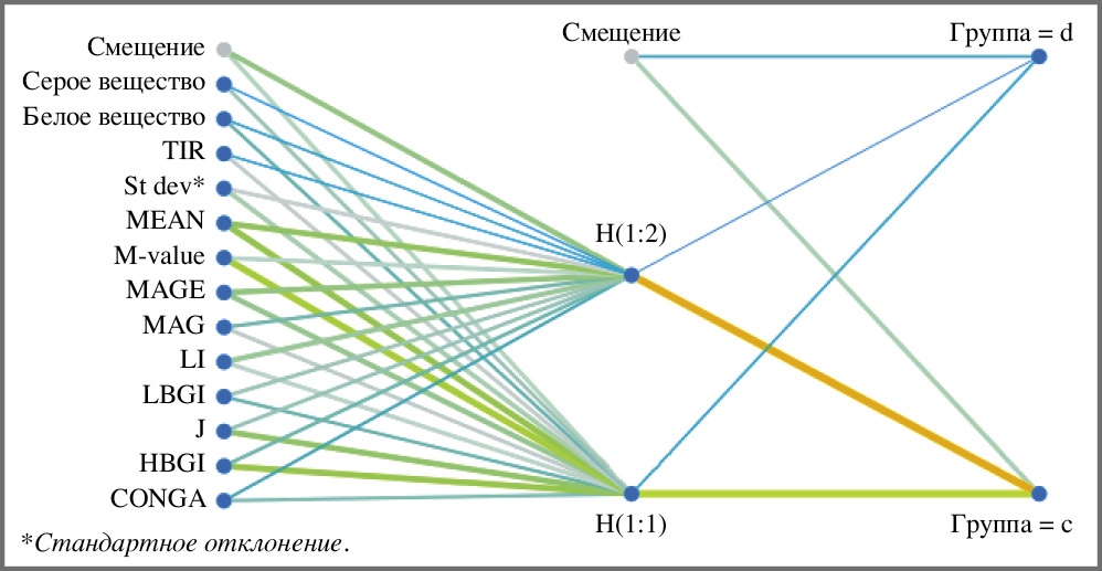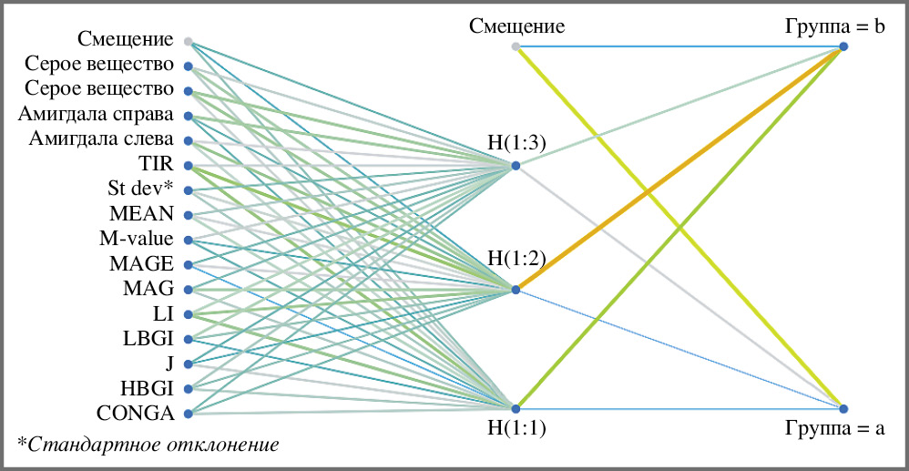 Рис. 3. Нейросетевая модель А СД 1, вариабельность гликемии vs МРТ.