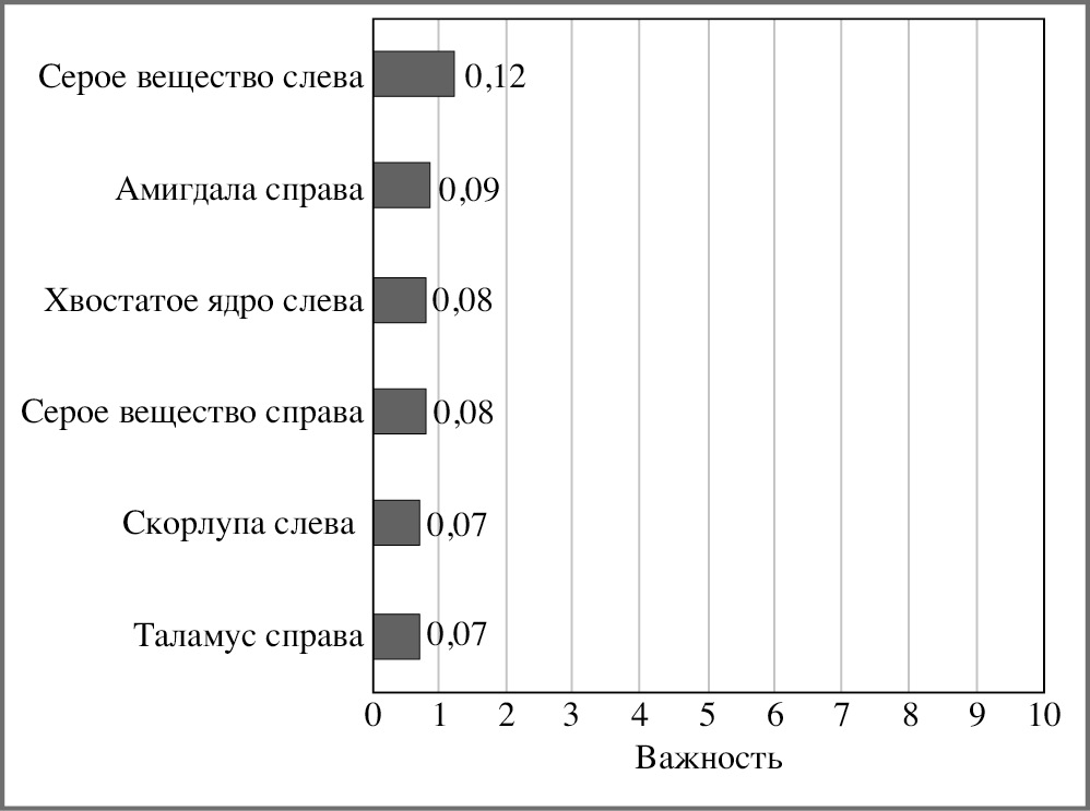 В результате построения модели Б СД 1, МРТ, ее точность определялась как 93,5%, что ниже, чем при использовании комбинации с параметрами вариабельности гликемии. Характеристика сети: число предикторов – 20, количество скрытых слоев – 1, количество нейронов в слое – 3, в слое вывода – 2. Основными областями, важными в прогнозировании когнитивных нарушений при СД 1, зарегистрированы: серое вещество слева и справа, хвостатое ядро и скорлупа слева, амидала и таламус справа (рис. 4).