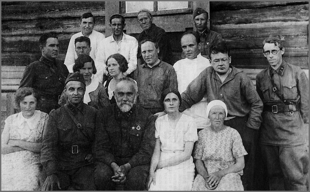 Рис. 2. Первая дальневосточная экспедиция (1937 г.). Поселок Обор. Северный отряд. Слева направо: А.Н. Скрынник, А.В. Гуцевич, д-р Перминова, В.Л. Ольшевская, П.Е. Грачев, Е.Н. Левкович, А.Н. Шаповал, Г.Н. Зорина-Николаева, Н.В. Рыжов.