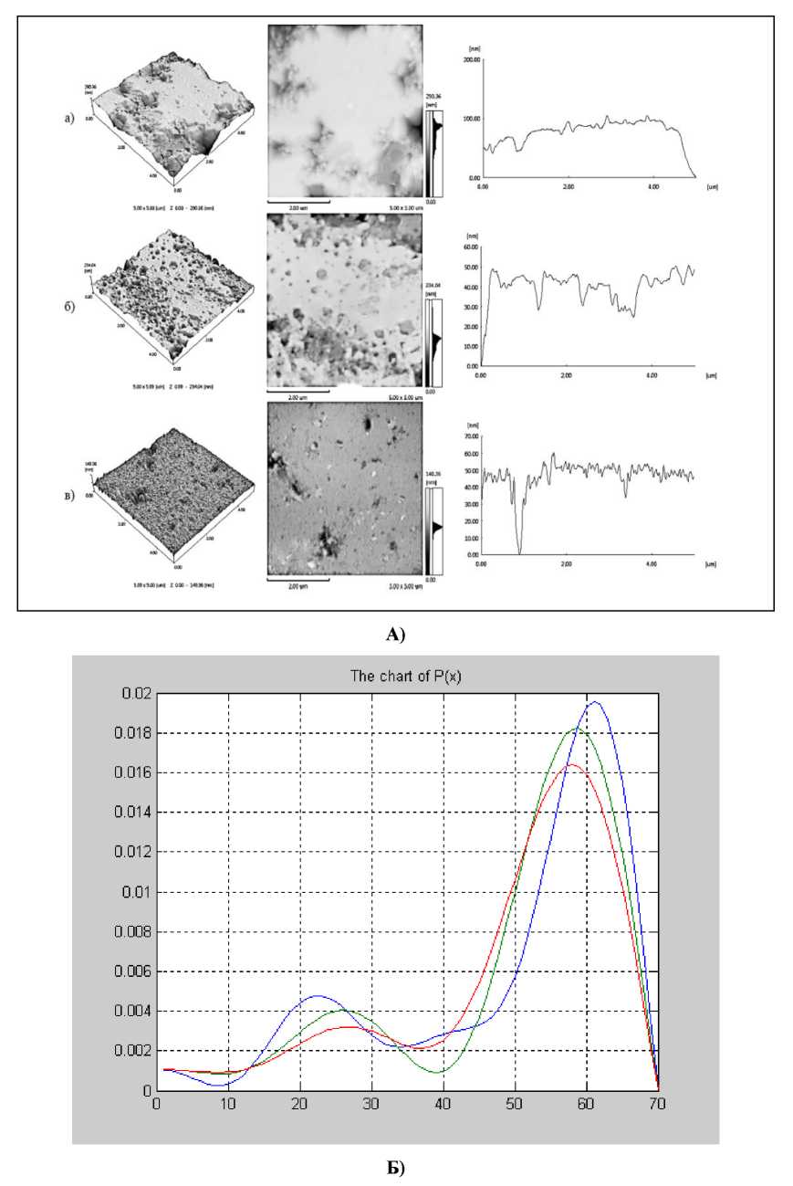 Fig. 1. А) Atomic-force microscopy images of membrane topologies and depth profile graphs of membrane for low POSS concentrations (wt.%). Б) Pore depth distribution laws for the first three selected membrane sections