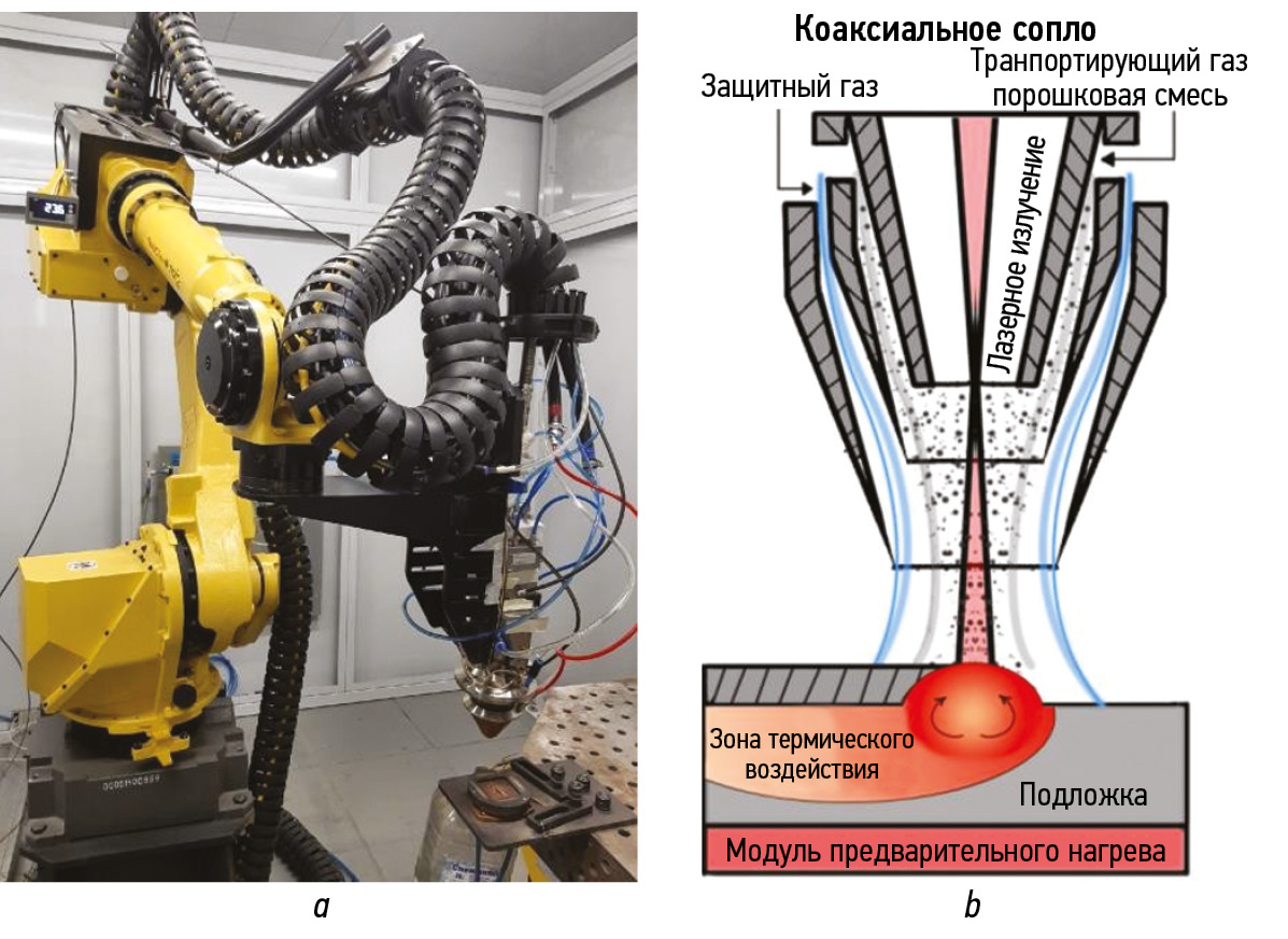 Рис. 2. Оборудование и принцип метода прямого лазерного выращивания: a ― комплекс для лазерной наплавки; b ― схема метода.