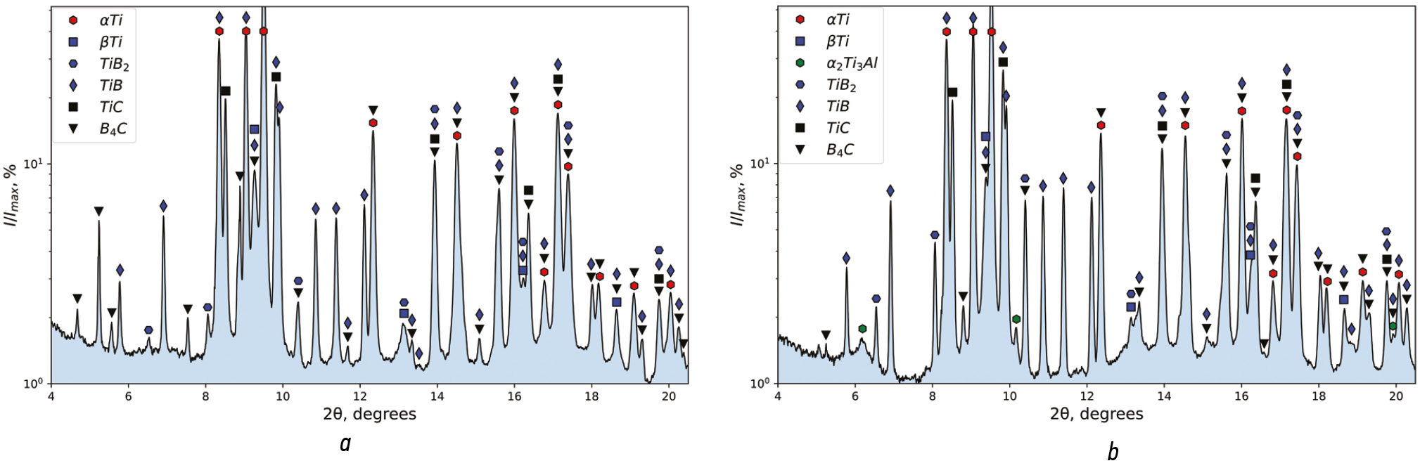 Интенсивность пиков α-Ti высока по сравнению с β-Ti на всех дифракционных картинах (рис. 4), что соответствует заявленному составу сплава. Дифрактограмма показывает, что пики TiB2 имеют низкую интенсивность и уширение, что может свидетельствовать о низкой концентрации частиц в объеме, а также об относительно небольшом размере частиц. Более того, интенсивность пиков, соответствующих вторичным фазам TiB, TiC, TiB2, по-видимому, аналогична на рис. 4, a и b.