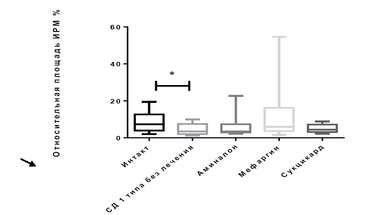 Material and methods. Diabetes mellitus was modeled on 12-month-old white outbred female laboratory rats. The animals were divided into 5 groups: intact group, untreated type 1 diabetes mellitus group, and pharmacological correction group with aminalon, mefargin, and succicard. Diabetes mellitus (DM) was modeled by a single intraperitoneal administration of streptozotocin (Sigma, USA) dissolved in citrate buffer (0.1 M, pH 4.5) at a dose of 60 mg/kg after 48-hour food deprivation. Treatment was started 6 months after modeling DM. Statistical processing of the obtained results was performed by descriptive and analytical statistics methods using Prism 6 software (GraphPad Software Inc., USA).