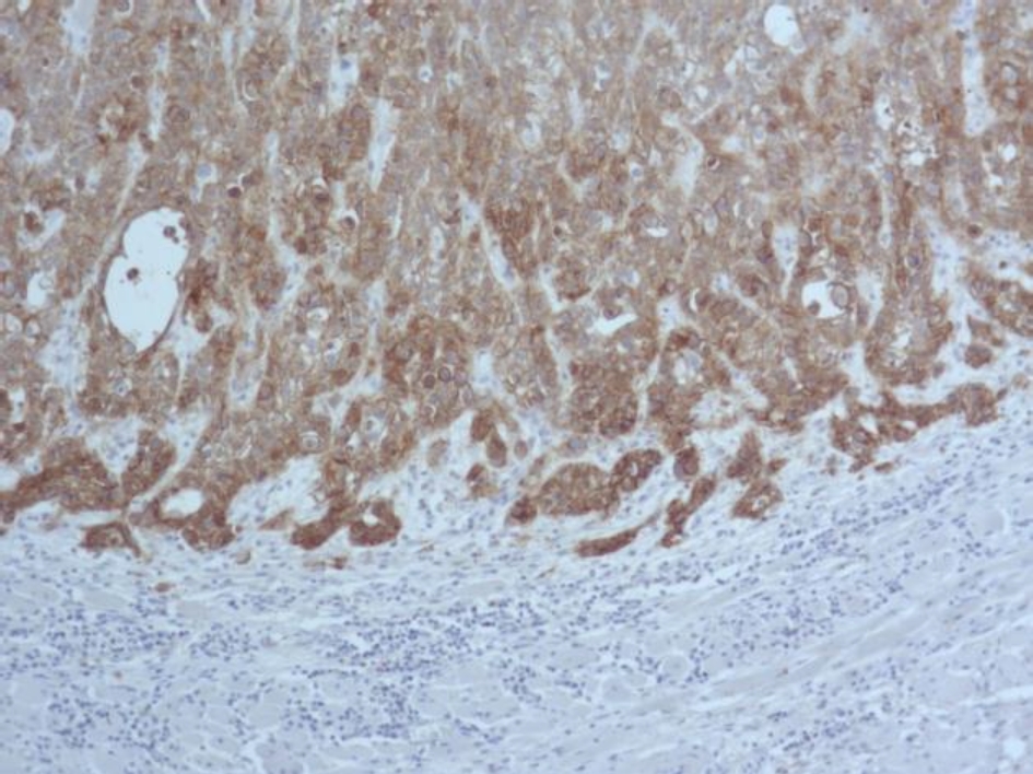 Рис. 3. Диффузная экспрессия EGFR в клетках плоскоклеточного рака языка. ИГХ окрашивание, ×100